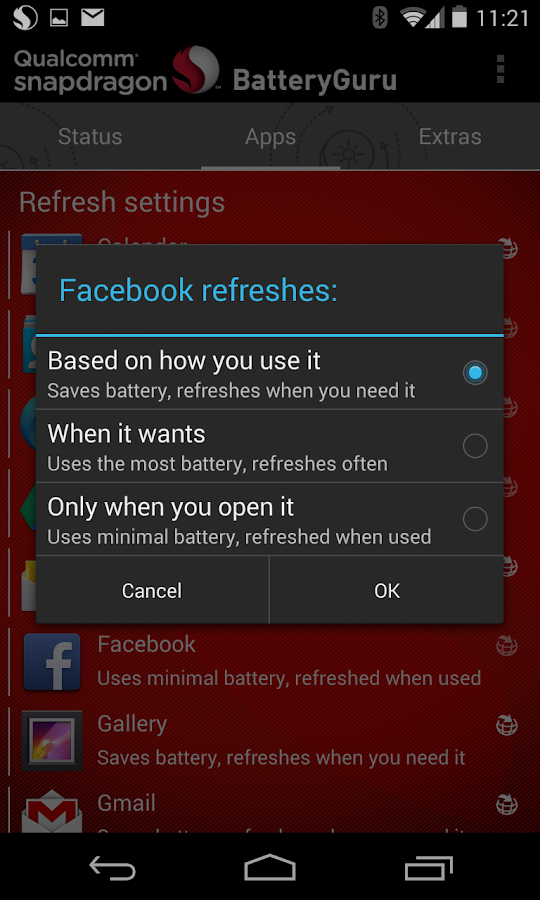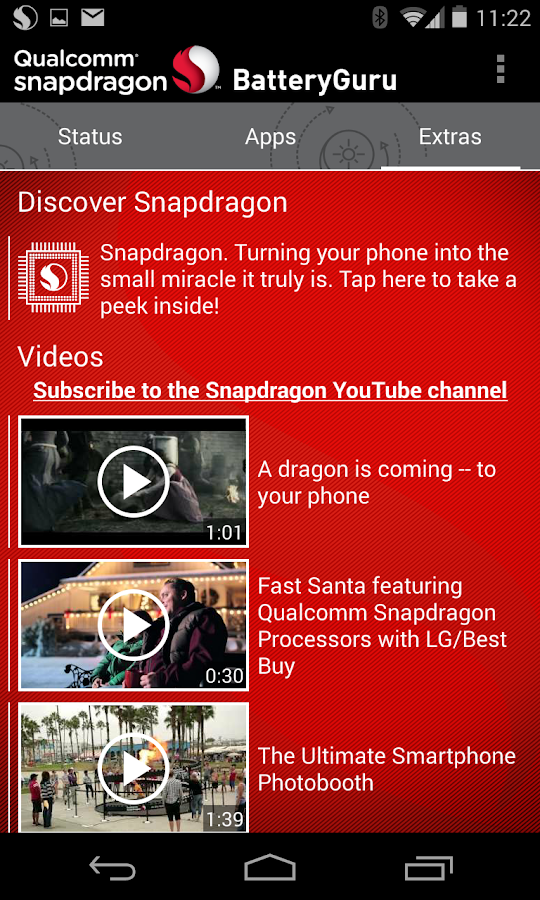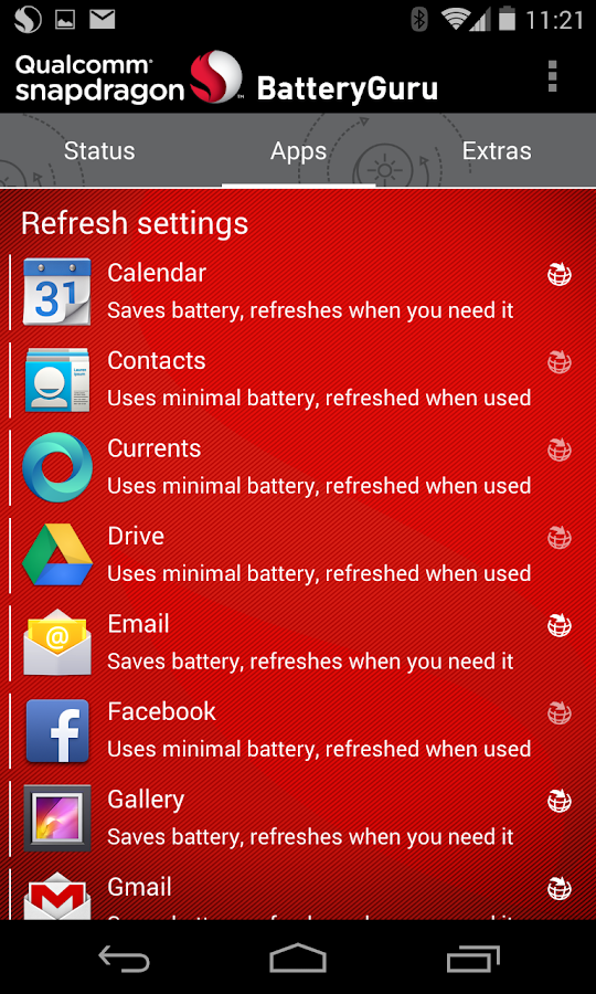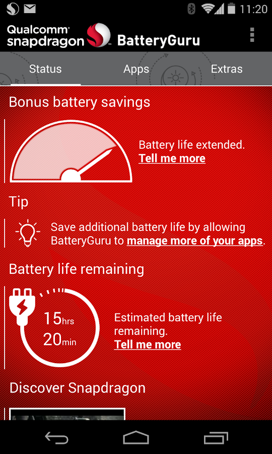 Snapdragon™ BatteryGuru is a battery life saver app that extends battery performance and improves overall user experience by intelligently making changes that optimize device functionality in phones with Snapdragon mobile processors. This app: